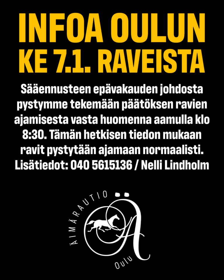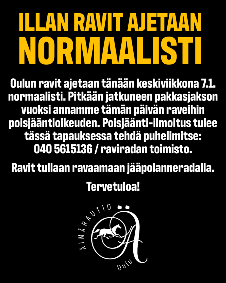 Oulun ravit ajetaan tänään keskiviikkona normaalisti. Pitkään jatkuneen pakkasjakson vuoksi annamme tämän päivän raveihin poisjääntioikeuden. Poisjäänti-ilmoitus tulee tässä tapauksessa tehdä puhelimitse: 040 5615136 / raviradan toimisto.
