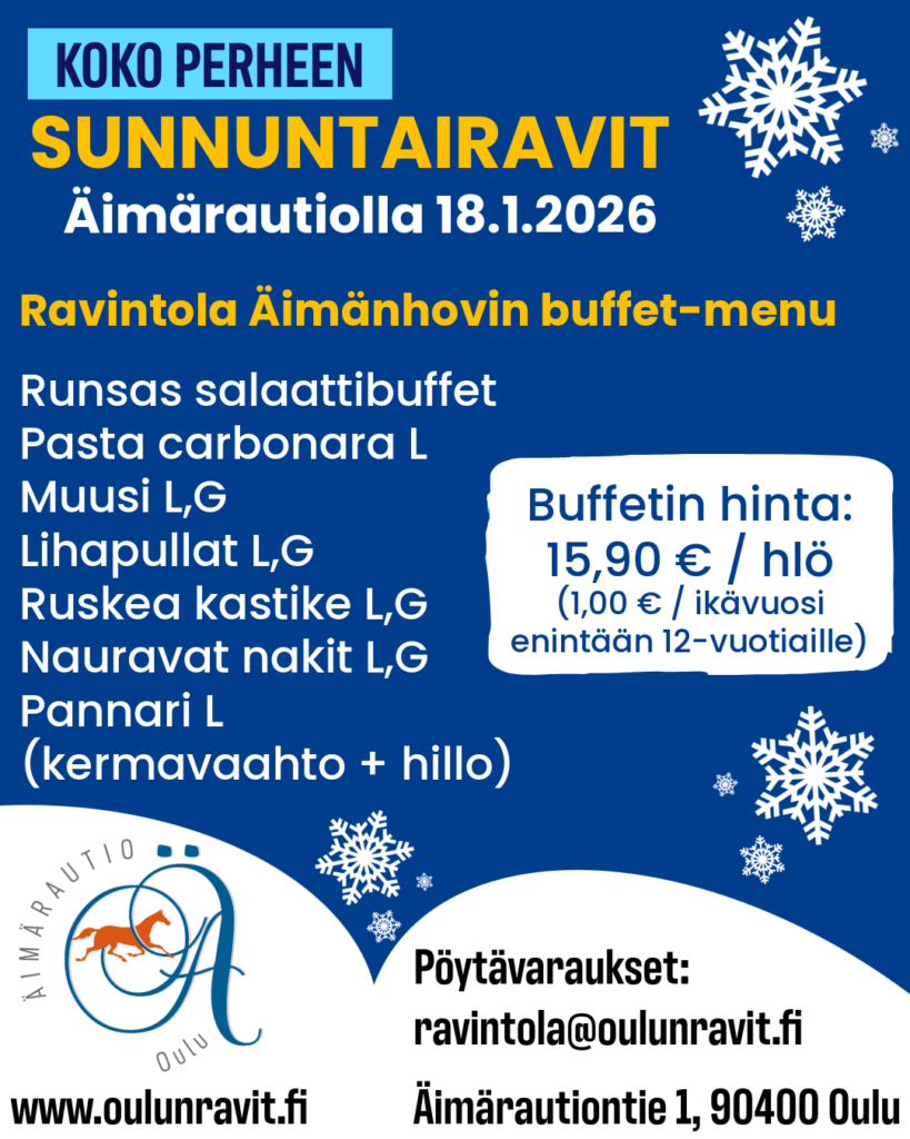 Ravintola Äimänhovissa tarjolla maistuva buffet-kattaus hintaan 15,90 € / henkilö (1,00 € / ikävuosi enintään 12-vuotiaille). Pöytävaraukset voit tehdä ennakkoon osoitteesta ravintola@oulunravit.fi. Tervetuloa!